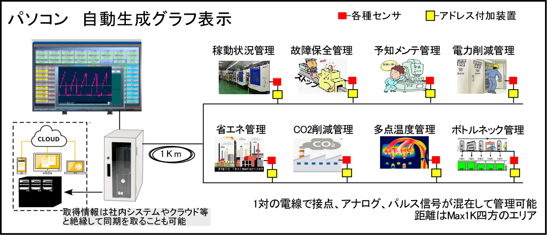 センサと配線はそのままで、弊社の多重伝送が可能になるシステム・ユニバーサルラインを導入することでシステム化できます。監視点数をさらに増やすことができ、更には機械ごとの個別監視を監視盤やパソコンでの管理が可能になります。